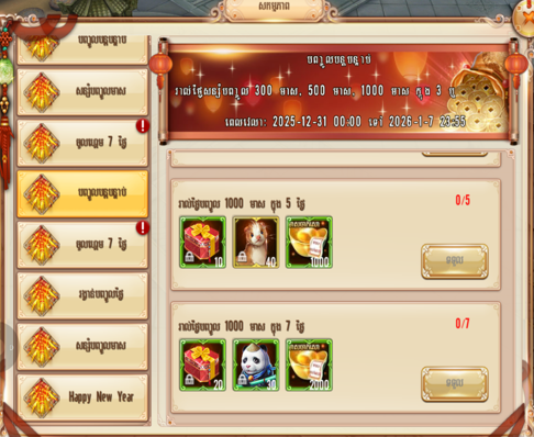 - រាល់ថ្ងៃសន្សំបញ្ចូលទឹកប្រាក់កម្រិត 100 gold, 300 gold, 1000 gold បន្ដរហូតក្នុង 3,5 ឬ 7 ថ្ងៃ នឹងទទួលបានបន្ថែមរង្វាន់ពិសេស!!!