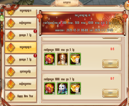 - រាល់ថ្ងៃសន្សំបញ្ចូលទឹកប្រាក់កម្រិត 100 gold, 300 gold, 1000 gold បន្ដរហូតក្នុង 3,5 ឬ 7 ថ្ងៃ នឹងទទួលបានបន្ថែមរង្វាន់ពិសេស!!!