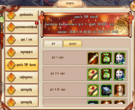 | 2-3 | ថ្នាក់ទីប្រាំ | 1 | ត្រូវការចំណាយឈានដល់ 30,000 មាស ឬមាសចាក់សោ អ្នកដែលមិនបំពេញតាមតម្រូវការនឹងមិនទទួលបានរង្វាន់ទេ |